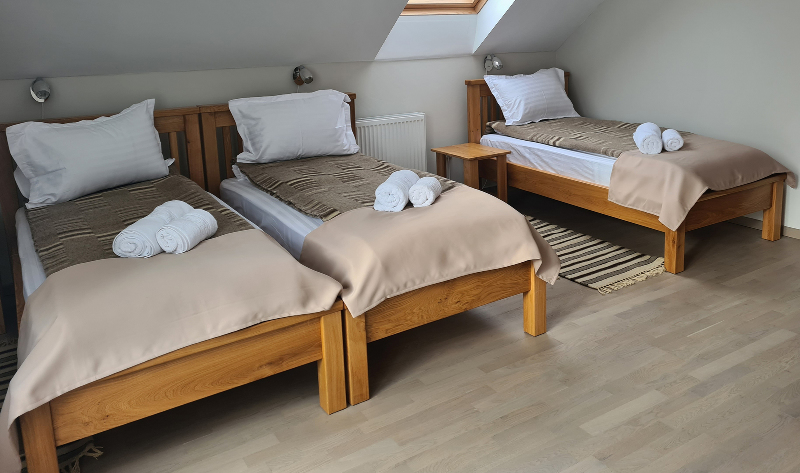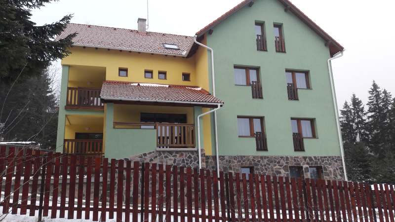 Oferă posibilități de cazare confortabilă în 5 apartamente pentru cel mult 24 de persoane tot anul. Casa are trei etaje. La parter se află un apartament spațios cu o cameră de zi cu șemineu, cu sufragerie, cu o bucătărie americană bine echipată (plită cu inducție, cuptor cu microunde, aparat de sendviș, expresor cafea, frigider, set tacâmuri complet pentru 12 persoane). Două camere, 20 metri pătrați fiecare dotat cu un pat dublu și un pat simplu, respectiv cu două băi. La etaj se află un apartament cu caracteristici identice cu cel de la parter. În mansardă sunt 3 apartamente mici, 18 metri pătrați fiecare, dotate cu băi separate și cu o bucătărie-sufragerie comună. |